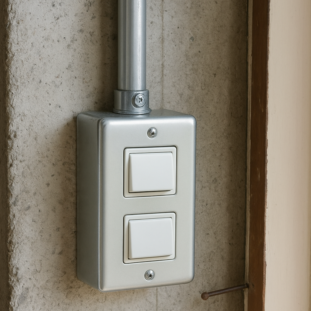 Un centro de alumbrado exterior con canalización a la vista en EMT corresponde a la instalación de un centro de luz en patios, fachadas, terrazas u otros espacios al aire libre, donde el cableado se protege mediante tuberías metálicas rígidas conocidas como EMT (Electrical Metallic Tubing). Estas tuberías se instalan sobre los muros o superficies, quedando visibles, pero garantizando mayor resistencia mecánica, durabilidad y seguridad frente a la intemperie en comparación con canalizaciones plásticas. Además, este tipo de instalación aporta un acabado limpio y de estilo industrial, ideal para quienes buscan funcionalidad y estética al mismo tiempo. La instalación estándar considera hasta 5 metros lineales desde la caja de derivación hasta el centro de alumbrado y hacia el interruptor.
