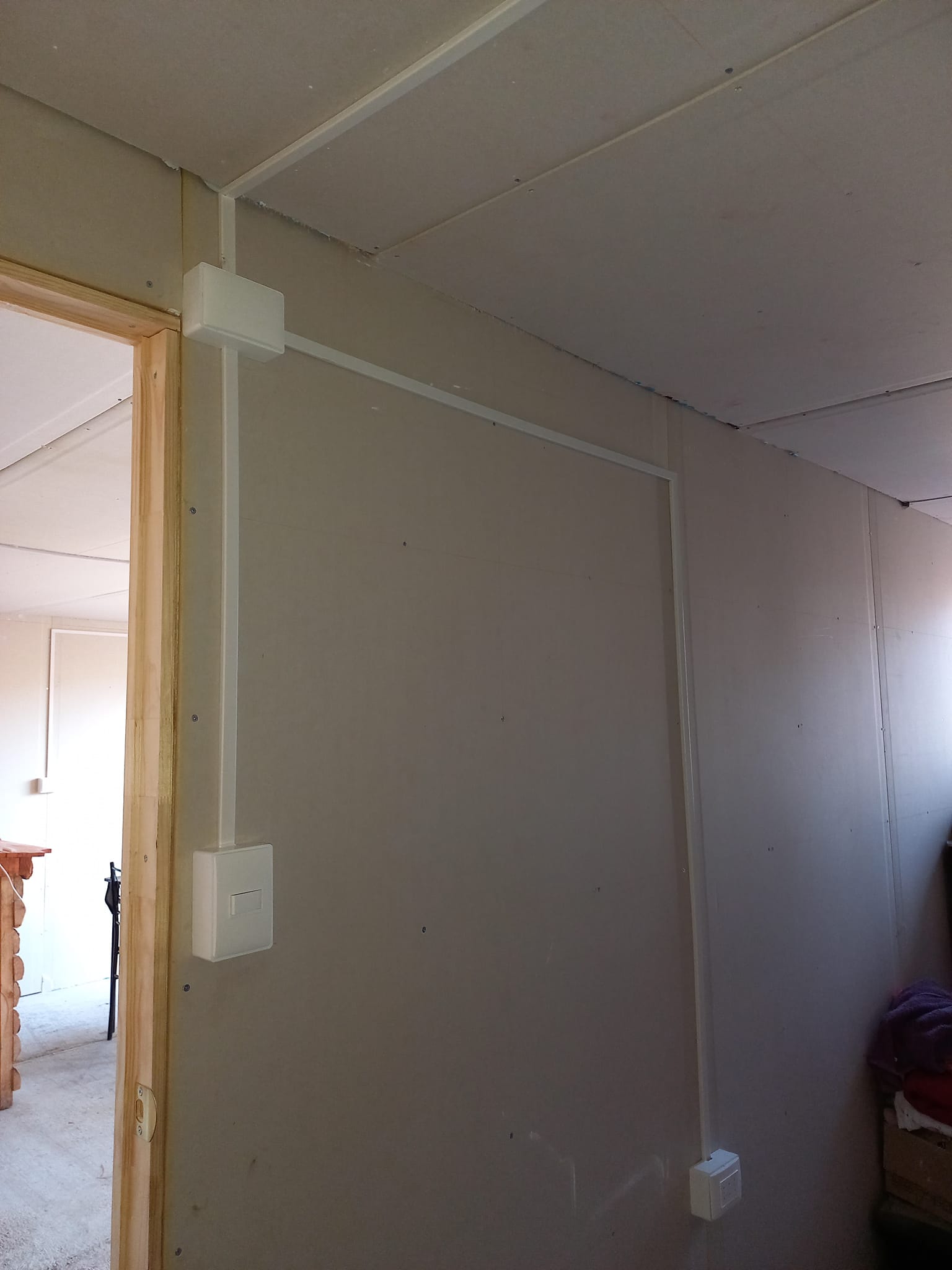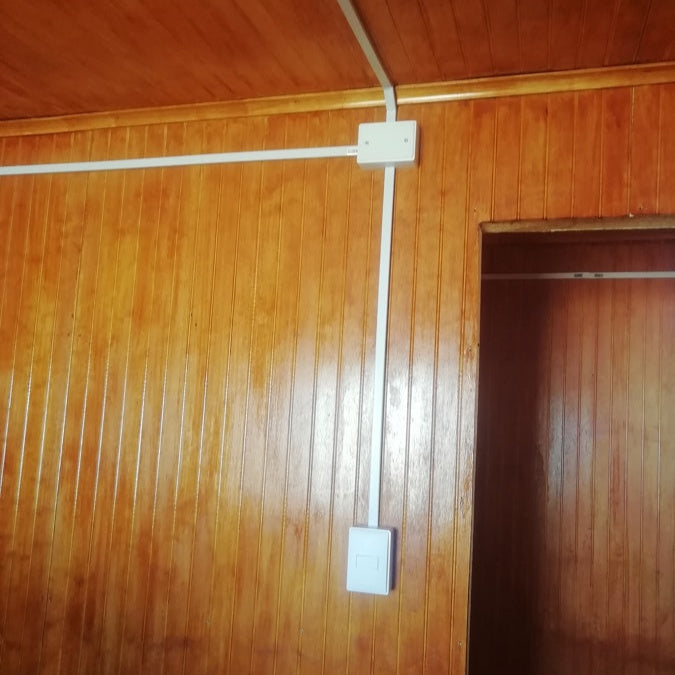 Un centro de alumbrado interior con canalización a la vista es la instalación de un punto de luz dentro de espacios como habitaciones, oficinas o pasillos, controlado desde un interruptor. Para llevar la corriente eléctrica hasta ese punto se utilizan canaletas blancas o similares, que permiten conducir los cables de forma segura y ordenada sin necesidad de romper muros ni hacer trabajos de obra. Este sistema es práctico, rápido de instalar y deja el cableado accesible para futuras reparaciones o modificaciones. La instalación estándar considera hasta 5 metros desde la caja de distribución al interruptor, y 5 metros más hasta el centro de alumbrado.
